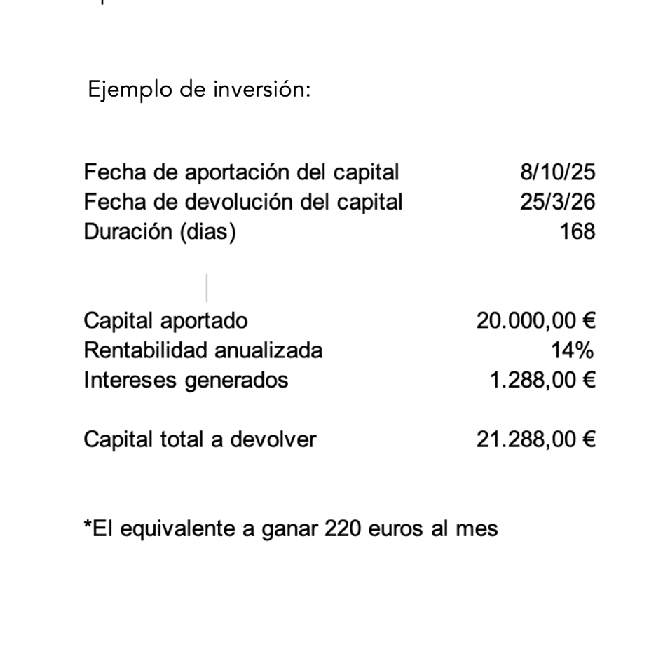1) Rentabilidad anualizada del 14% sobre el capital aportado. Capital mínimo de 10.000 euros.